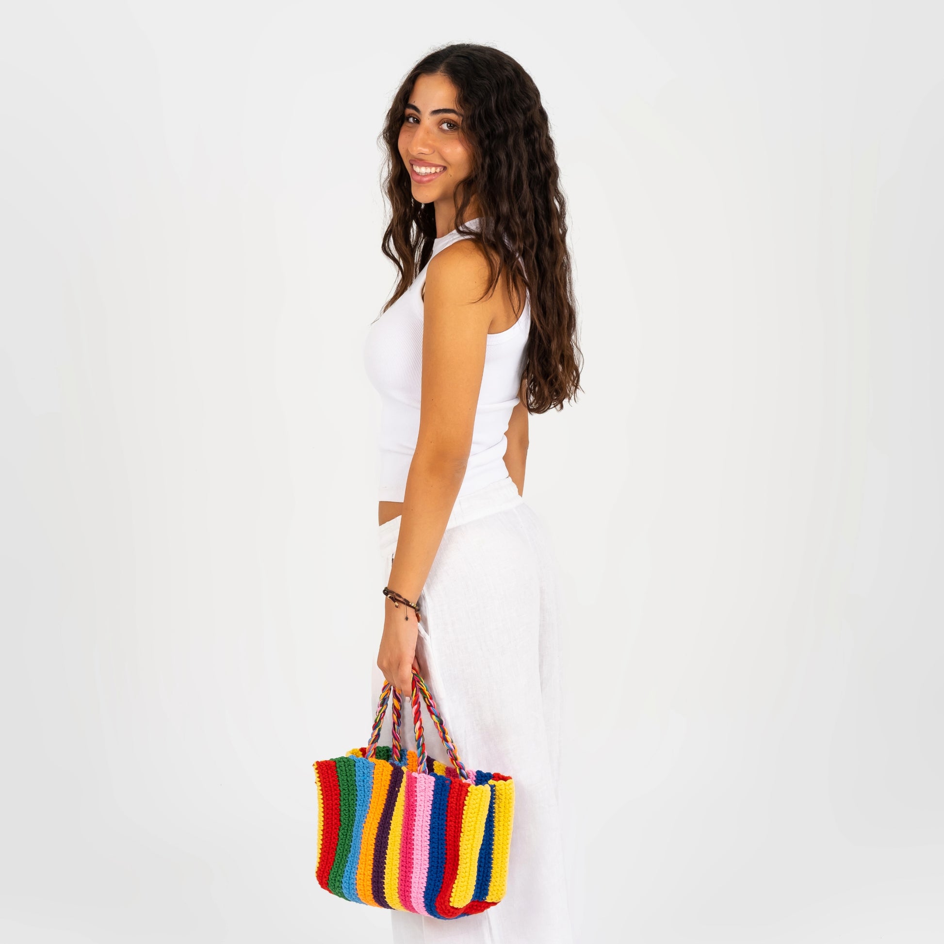 Meet The Happy Tote – your new go-to for color, joy, and sunshine energy. Hand-crocheted with love by skilled women artisans in Egypt, this bag is bursting with bold, playful stripes that brighten any outfit and mood. Made for the fun, free-spirited, and effortlessly cool, it’s the perfect mix of craftsmanship and happiness.